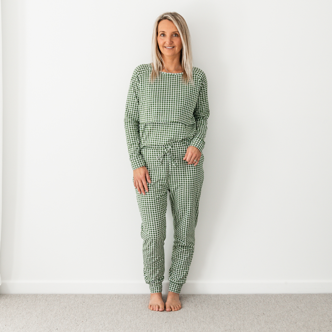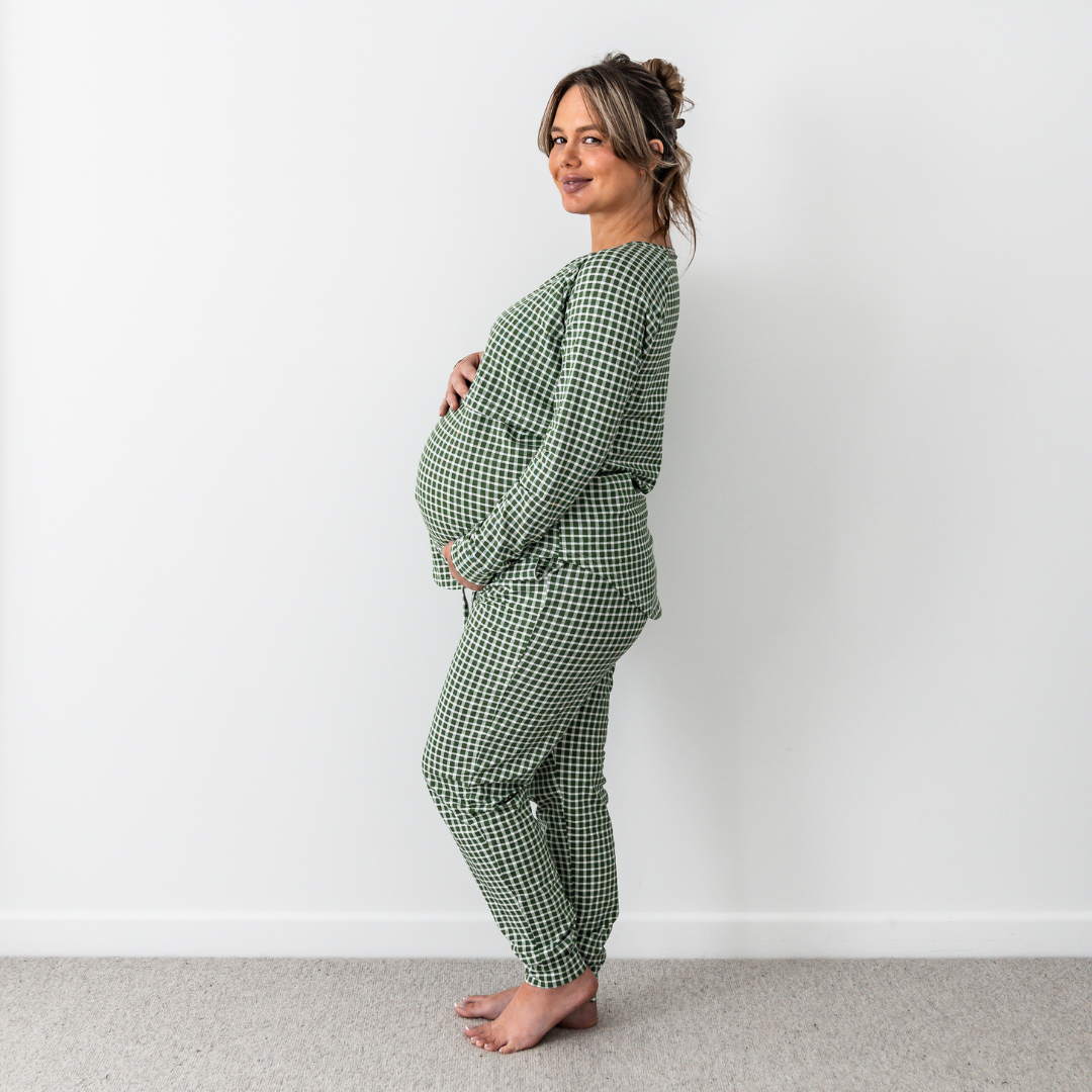 Introducing our cozy breastfeeding Pjs in Forest Gingham, perfect for pregnant or breastfeeding mums with easy lift-up access for night time feedings.